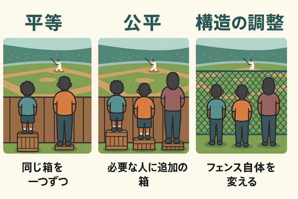 上の図は、ある有名なイラストをもとにしたもので、「平等(Equality)」と「公平(Equity)」、そして「構造の調整(Justice)」の違いを端的に表しています。左の絵では、3人それぞれに等しく木箱が1つずつ配られています(平等)。しかし、背の低い人は箱に乗ってもまだフェンスに遮られて試合が見えません。これは現実の社会でも、「みんな一律に同じサポートを与えているのだから公平だろう」という考え方が、結果的に弱い立場の人に不利を強いる状況を示しています。真ん中の絵では、背の低い人には2つ、真ん中の人には1つ、背の高い人には箱を渡さないことで、全員がフェンス越しに試合を観戦できるようになっています(公平)。これは、必要な人に追加のサポート(踏み台=合理的配慮)を提供することで結果の平等を実現している状態です。そして右の絵では、もはや箱は必要ありません。フェンスそのものが金網状に改良されていて、誰でも最初から問題なく試合を観られる環境が整っています。これはつまり、個別に踏み台を配るまでもなく構造側を調整してバリアを取り除いた状態**です。