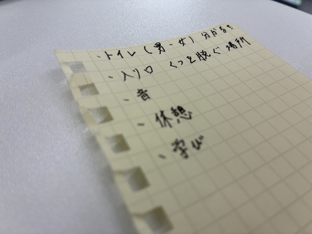支援スタッフの業務は「通所支援」「記録・報告」「ミーティング」「実務準備」など多岐にわたります。だからこそ、シフト設計・業務割り振りを見直し、事務作業が偏らないよう、支援実務が続きすぎないよう、休憩と切り替えがしやすい動きやすさを検討しています。